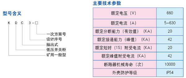 KDC3礦用一般型抽出式低壓開(kāi)關(guān)柜適用于煤礦井下無(wú)瓦斯、煤塵爆炸危險(xiǎn)場(chǎng)所或其它類似的工業(yè)生產(chǎn)部門,對(duì)額定電壓至660V、額定頻率作為50Hz的三相交流低壓配電系統(tǒng)中作為動(dòng)力、配電、照明、電機(jī)及其它電氣設(shè)備的起動(dòng)、控制和保護(hù)的開(kāi)關(guān)設(shè)備及電源變換設(shè)備。